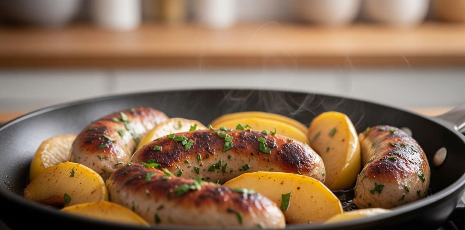 Begin by slicing chicken sausage and searing it in olive oil over medium heat until browned. Remove the sausage and set it aside. In the same pan, sauté sliced apples and onions until soft. Season with salt, pepper, and garlic powder.Return the sausage to the pan. Deglaze with chicken stock, then add a splash of cream and apple cider vinegar. This creates a rich, tangy sauce that coats the sausage and apples.Sweet-crisp apples like Fuji, Gala, or Braeburn work best here. Pre-cooked sausages speed up the process. Watch the pan carefully to avoid burning the apples or sausage.